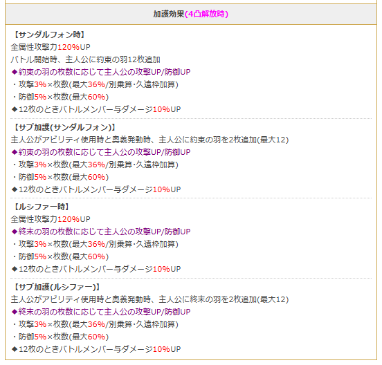 메인 효과:아군 전체가 오의 그리고 TA를 5회이상 발동한 턴 종료시, 주인공에게 타화자재他化自在 효과
