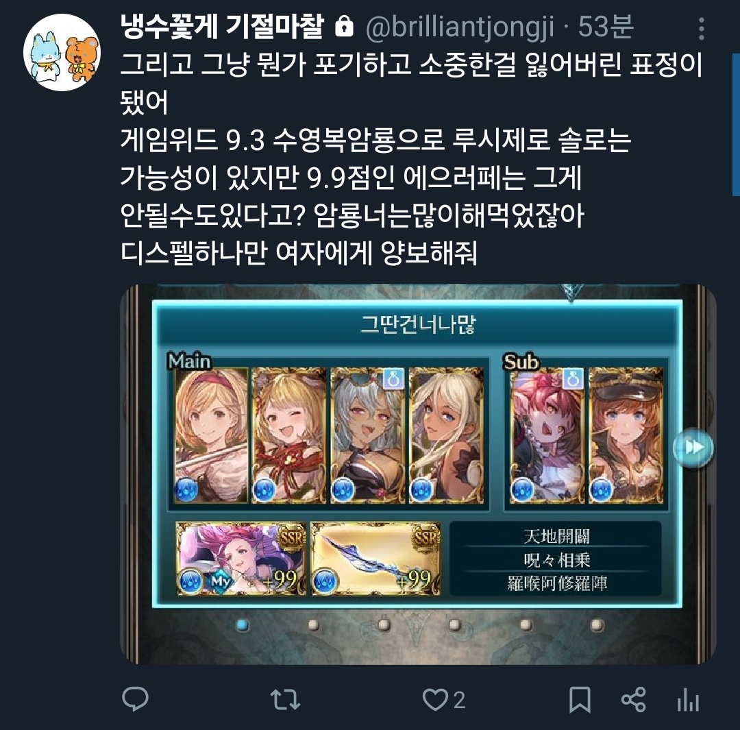 내 편성 문제가 아니라 그냥 캐릭터가 DPS가 안나오는 문제였어! 뭐 어쩔 수 없나, 애초에 DPS 뽑으라고 낸 캐릭터라고 하기엔 애매하고; 그냥제가애정충짓한다고그만...
